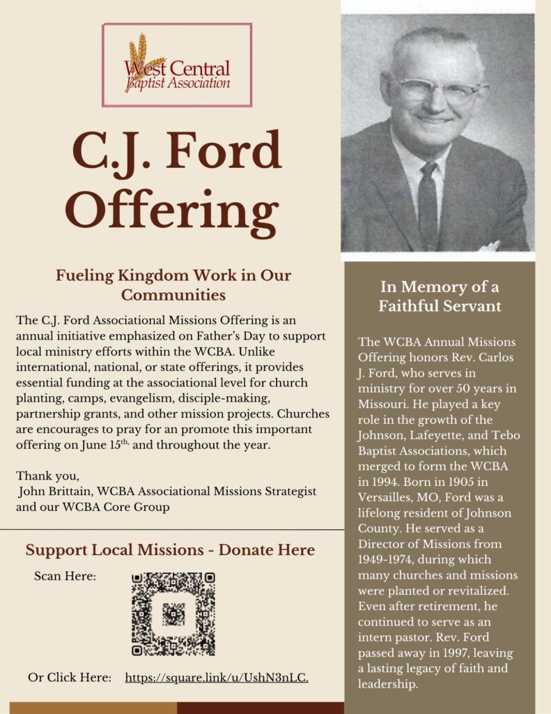 The C J Ford Associational Missions Offering is specifically designed as an emphasis on Father’s Day each year. However, it is something that can be contributed to at any time of the year, much like the Lottie Moon, Annie Armstrong and Rheubin L South offerings.
